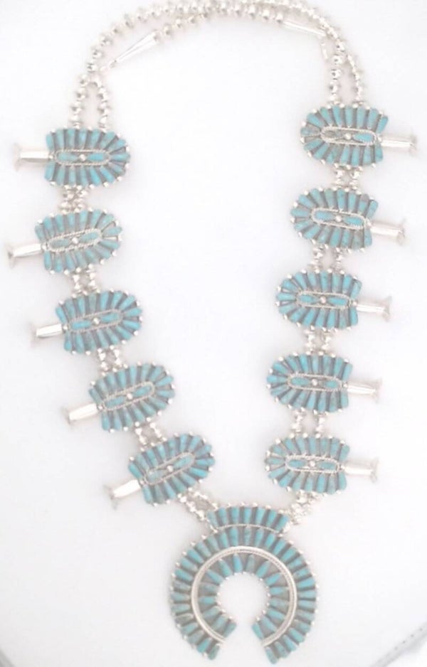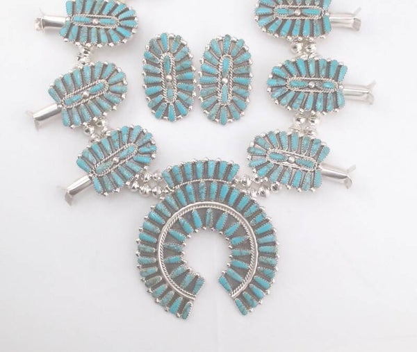 Cerillos Turquoise Sterling Silver Pettie Point Squash Blossom Set